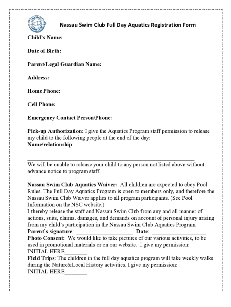 Nassau Swim Club Full Day Aquatics Registration FormChilds Name: Date of Birth: Parent/Legal Guardian Name: Address: Home Phone: Cell Phone: Emergency Contact Person/Phone: Pickup Authorization: I