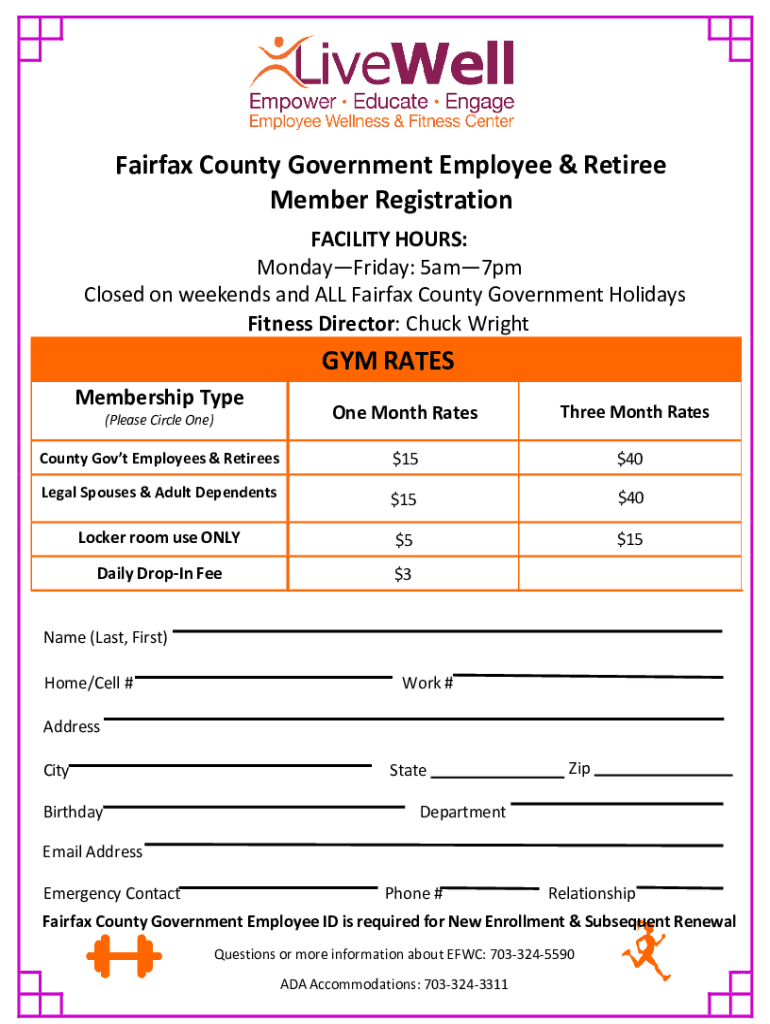 Fairfax County Government Employee & Retiree Member Registration FACILITY HOURS: MondayFriday: 5am7pm Closed on weekends and ALL Fairfax County Government Holidays Fitness Director: Chuck WrightGYM