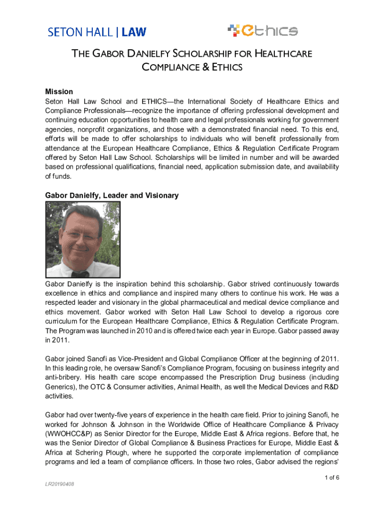 THE GABOR DANIELFY SCHOLARSHIP FOR HEALTHCARE COMPLIANCE & ETHICS Mission Seton Hall Law School and ETHICSthe International Society of Healthcare Ethics and Compliance Professionalsrecognize the importance