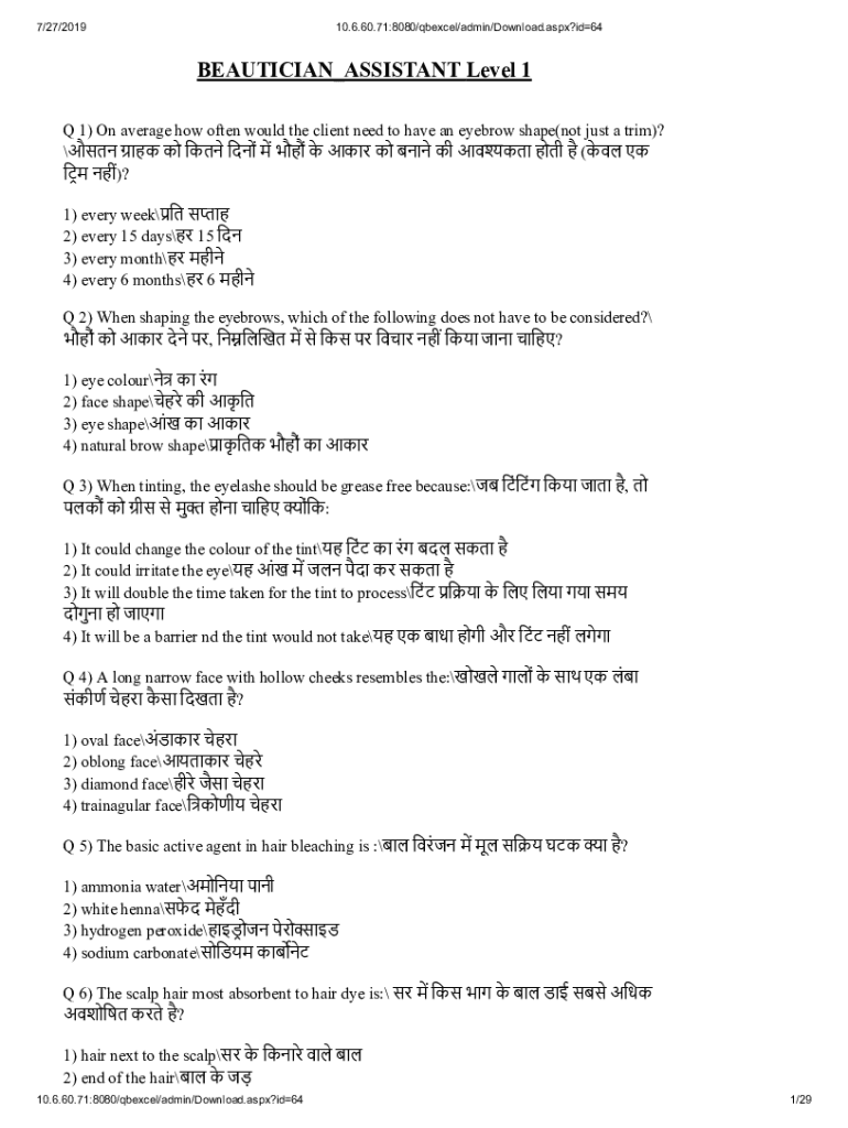 7/27/201910.6.60.71:8080/qbexcel/admin/Download.aspx?id64BEAUTICIAN_ASSISTANT Level 1 Q 1) On average how often would the client need to have an eyebrow shape(not just a trim)? ( )? 1) every week