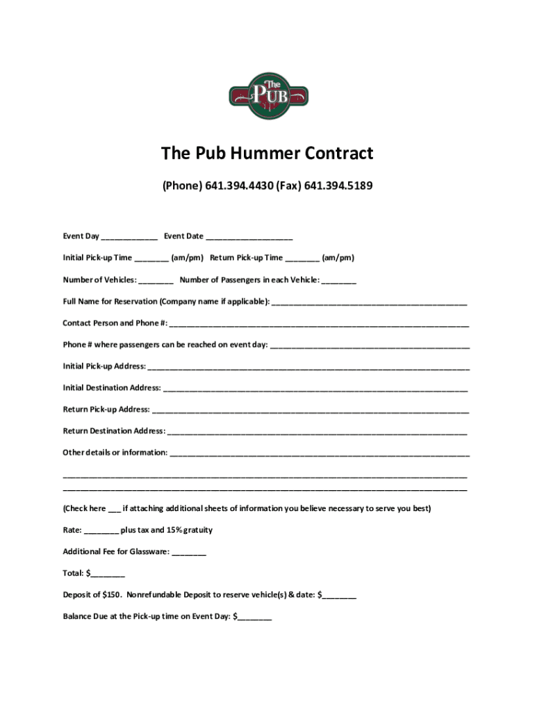 The Pub Hummer Contract (Phone) 641.394.4430 (Fax) 641.394.5189Event Day ___ Event Date ___ Initial Pickup Time ___ (am/pm) Return Pickup Time ___ (am/pm) Number of Vehicles: ___ Number of Passengers