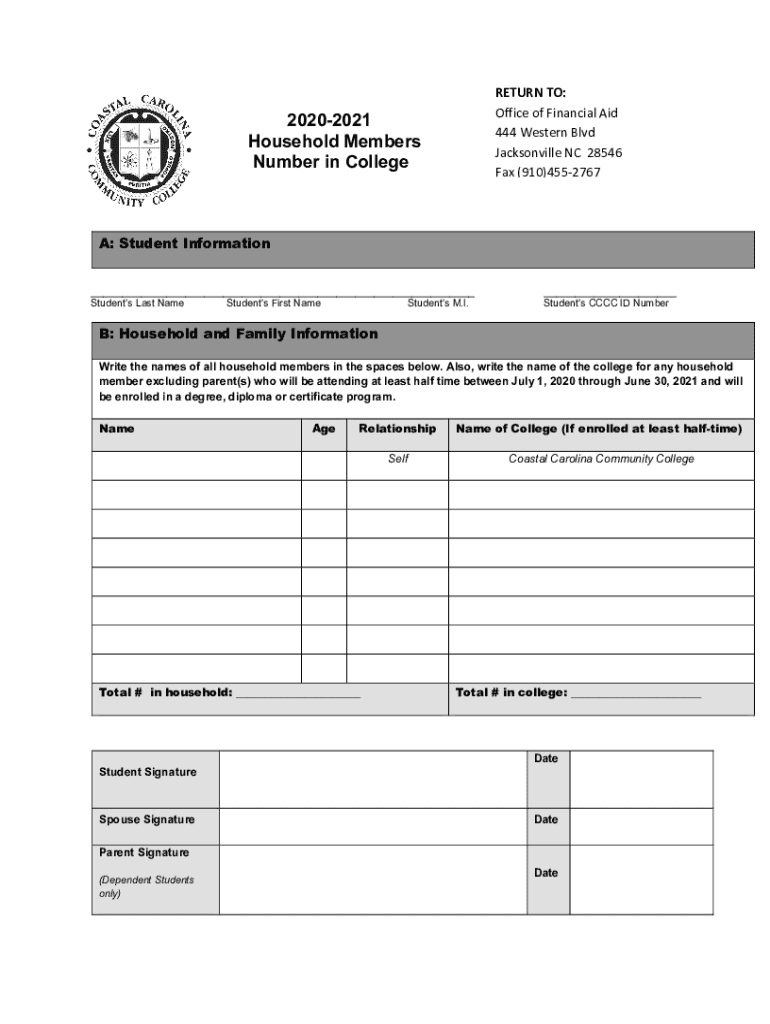 RETURN TO: Office of Financial Aid 444 Western Blvd Jacksonville NC 28546 Fax (910)455276720202021 Household Members Number in CollegeA: Student Information ___ Students Last NameStudents First NameStudents