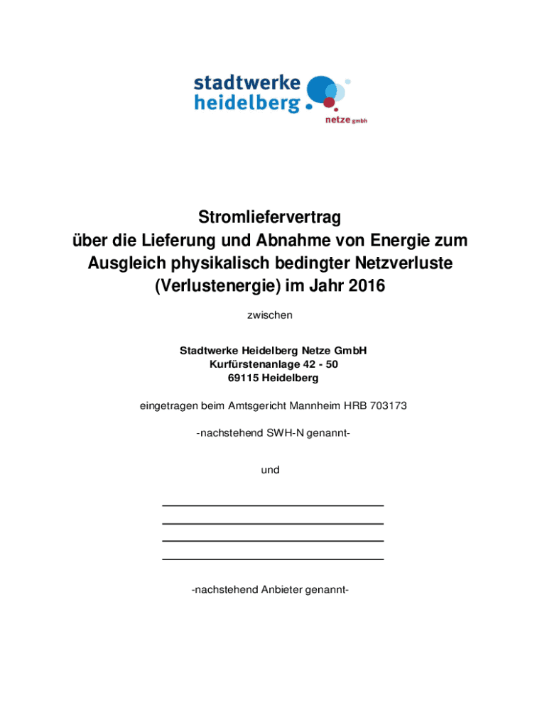 Stromliefervertrag ber die Lieferung und Abnahme von Energie zum Ausgleich physikalisch bedingter Netzverluste (Verlustenergie) im Jahr 2016 zwischen Stadtwerke Heidelberg Netze GmbH Kurfrstenanlage