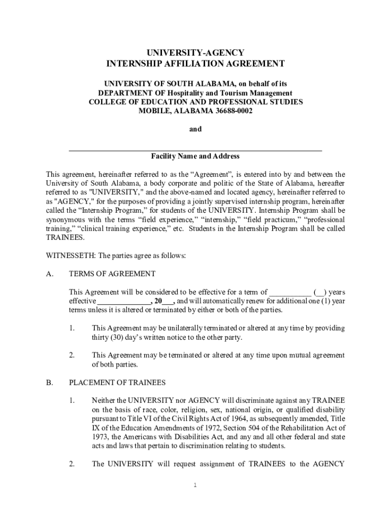 UNIVERSITYAGENCY INTERNSHIP AFFILIATION AGREEMENT UNIVERSITY OF SOUTH ALABAMA, on behalf of its DEPARTMENT OF Hospitality and Tourism Management COLLEGE OF EDUCATION AND PROFESSIONAL STUDIES MOBILE,