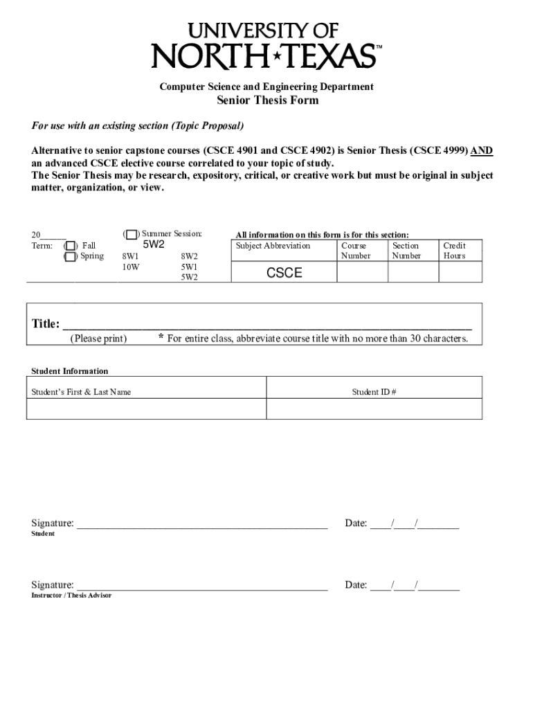 Computer Science and Engineering DepartmentSenior Thesis FormFor use with an existing section (Topic Proposal) Alternative to senior capstone courses (CSCE 4901 and CSCE 4902) is Senior Thesis (CSCE