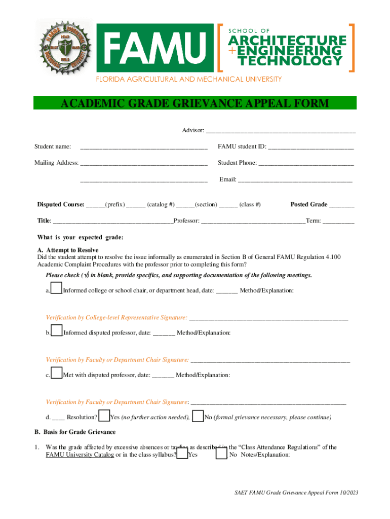 &ACADEMIC GRADE GRIEVANCE APPEAL FORM Advisor: ___ Student name:___FAMU student ID: ___Mailing Address: ___Student Phone: ______Email: ___Disputed Course: ___(prefix) ___ (catalog #) ___(section)