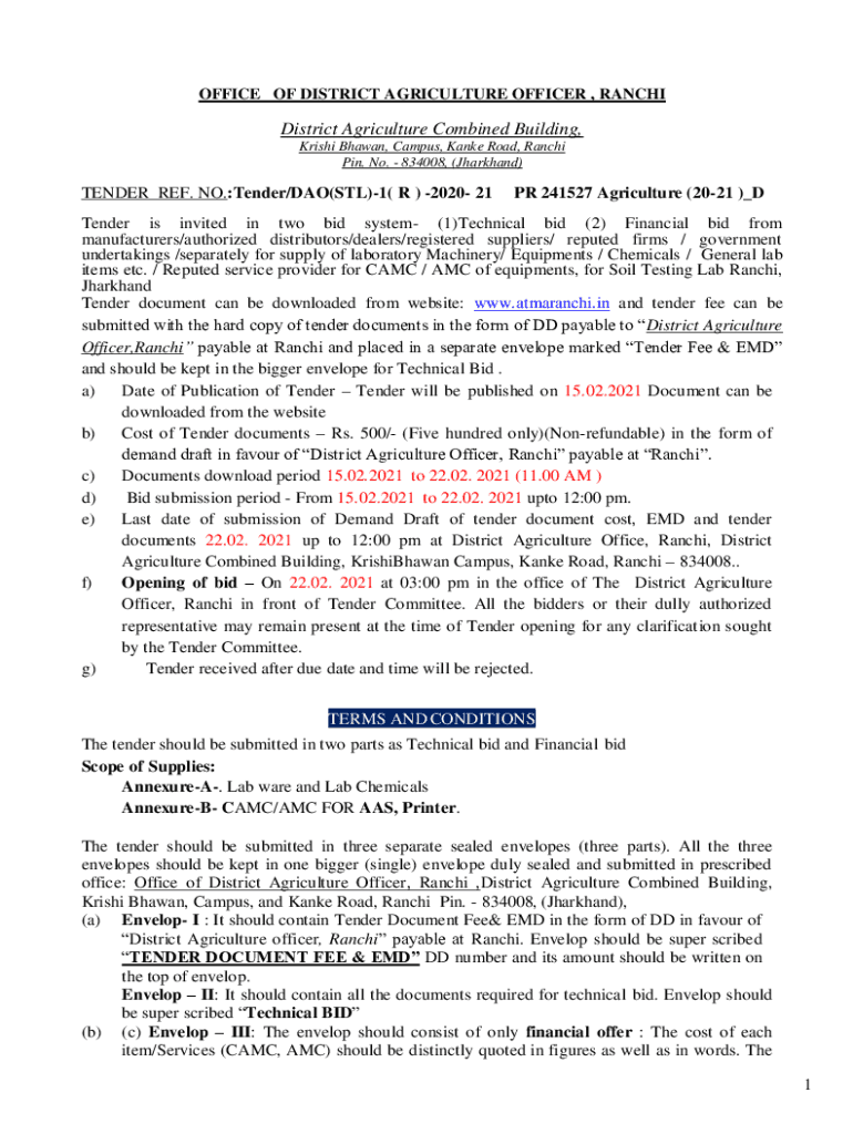 OFFICE OF DISTRICT AGRICULTURE OFFICER , RANCHIDistrict Agriculture Combined Building, Krishi Bhawan, Campus, Kanke Road, Ranchi Pin. No. 834008, (Jharkhand)TENDER REF. NO.:Tender/DAO(STL)1( R ) 2020