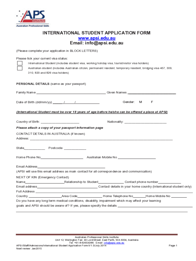 INTERNATIONAL STUDENT APPLICATION FORM www.apsi.edu.au Email: info@apsi.edu.au (Please complete your application in BLOCK LETTERS) Please tick your current visa status: International Student (includes