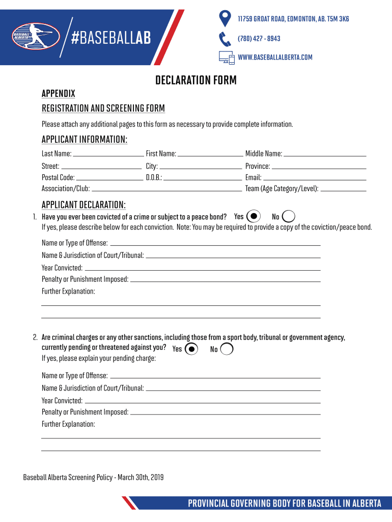11759 GROAT ROAD, EDMONTON, AB. T5M 3K6#BASEBALLAB(780) 427 8943 WWW.BASEBALLALBERTA.COMDECLARATION FORMAPPENDIX REGISTRATION AND SCREENING FORMPlease attach any additional pages to this form as necessary