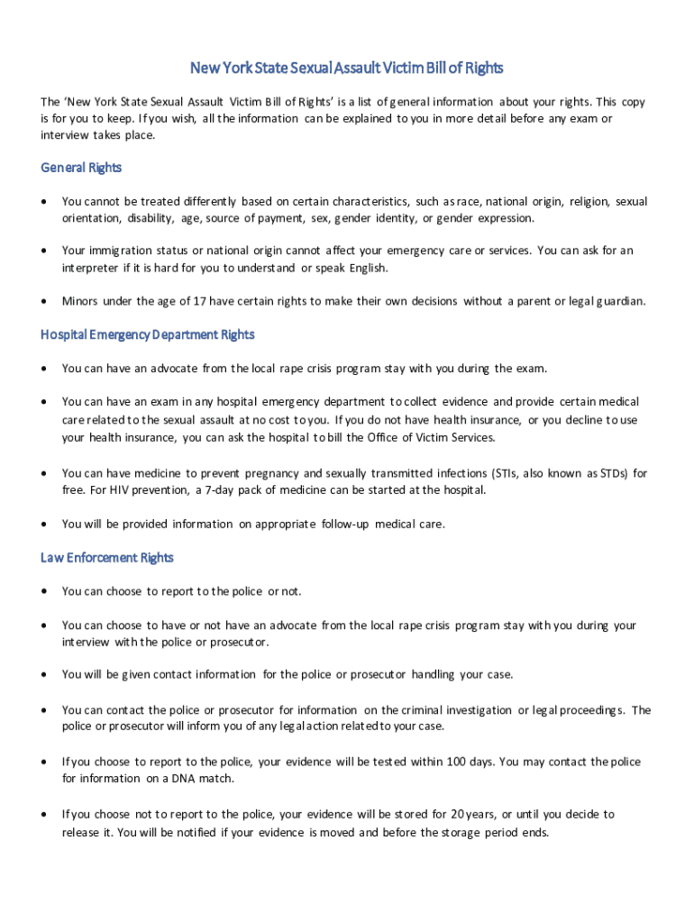 New York State Sexual Assault Victim Bill of Rights The New York State Sexual Assault Victim Bill of Rights is a list of general information about your rights. This copy is for you to keep. If you