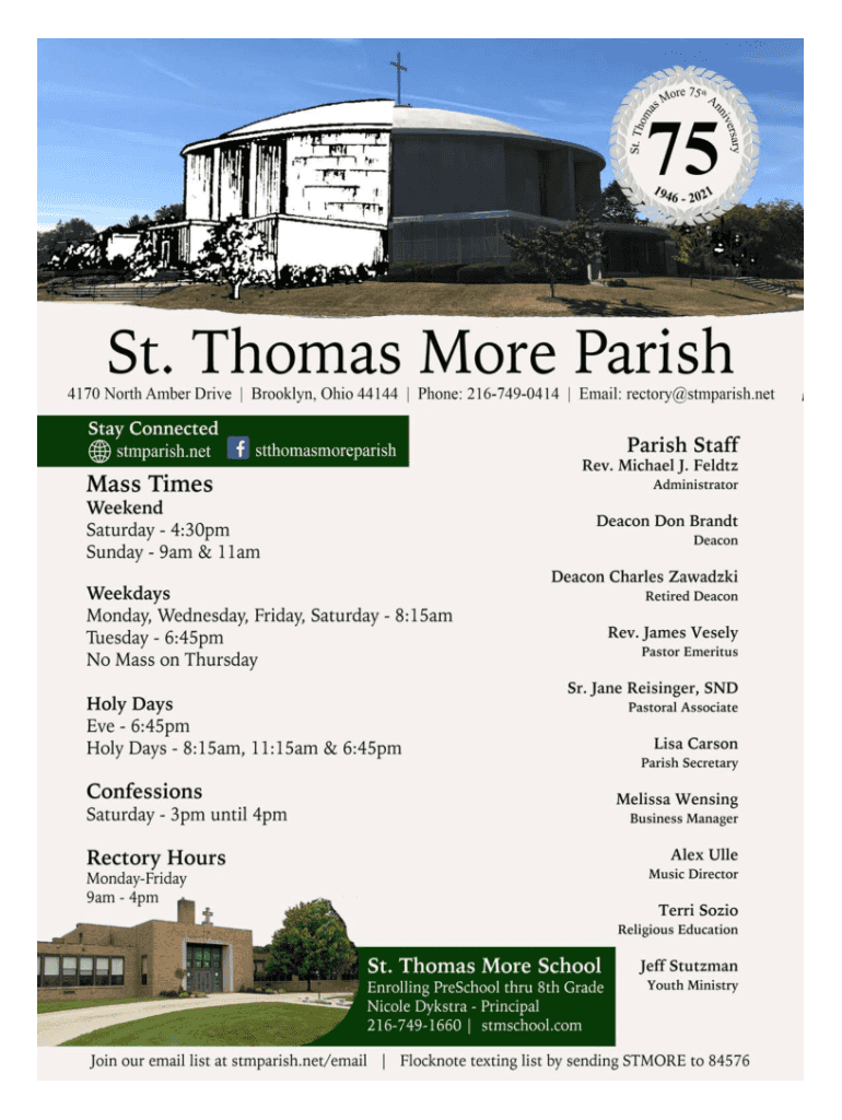St. Thomas More ChurchSATURDAY, OCTOBER 30 VIGIL 4:30PM Living and Deceased Sisters of the Humility of Mary SUNDAY, OCTOBER 31 THIRTYFIRST SUNDAY IN ORDINARY TIME *9:00AM Rich Roginsky 11:00AM People