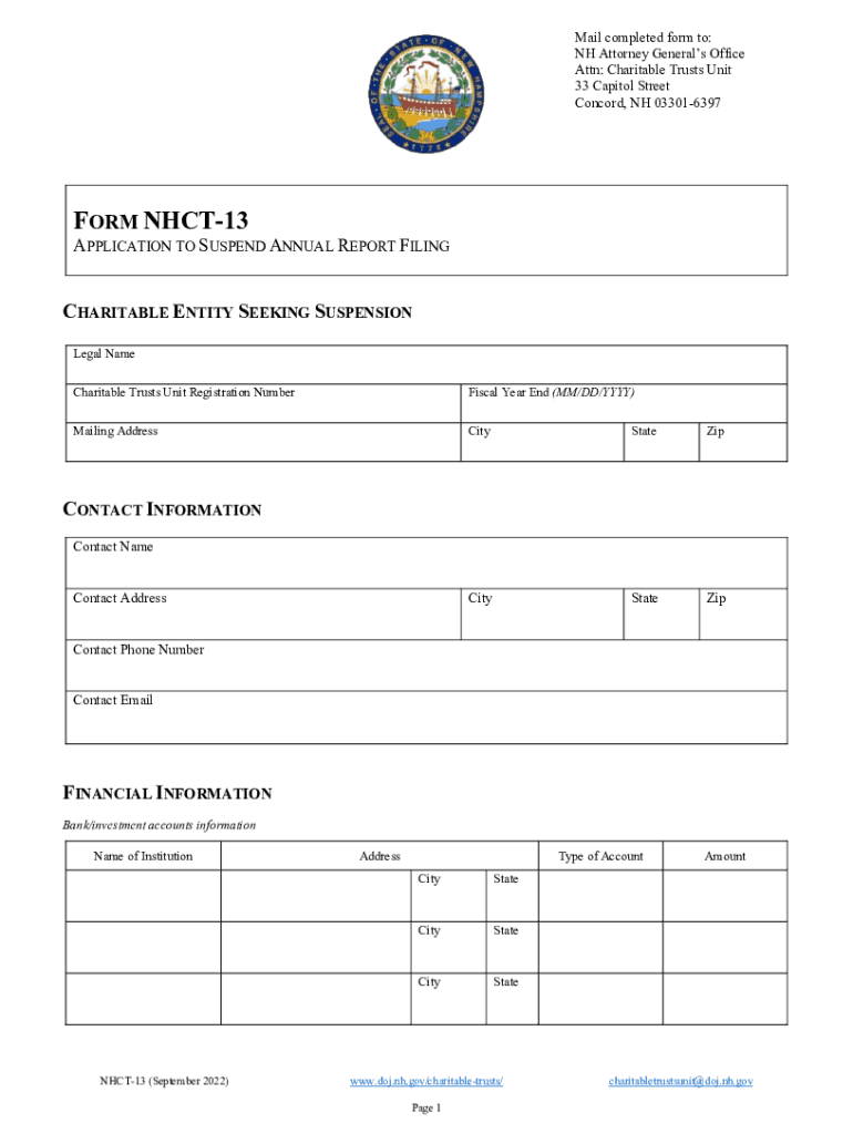 Mail completed form to: NH Attorney Generals Office Attn: Charitable Trusts Unit 33 Capitol Street Concord, NH 033016397FORM NHCT13APPLICATION TO SUSPEND ANNUAL REPORT FILINGCHARITABLE ENTITY SEEKING