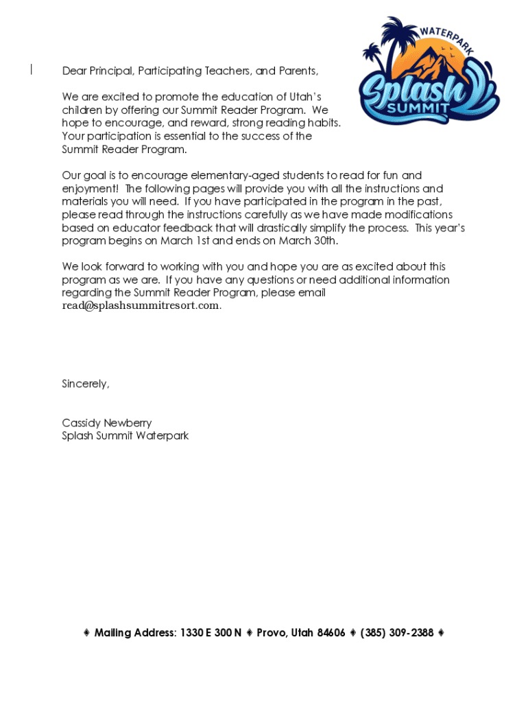 Dear Principal, Participating Teachers, and Parents, We are excited to promote the education of Utahs children by offering our Summit Reader Program. We hope to encourage, and reward, strong reading
