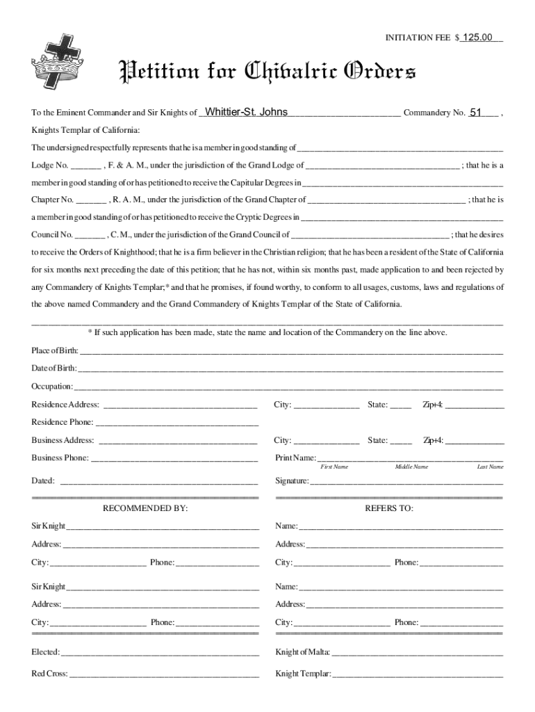 125.00 INITIATION FEE $___Petition for Chivalric Orders WhittierSt. Johns To the Eminent Commander and Sir Knights of ___ Commandery No. ___ , 51 Knights Templar of California: The undersigned respectfully