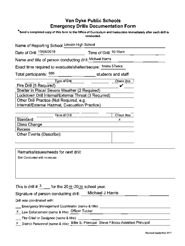 Van Dyke Public SchoolsEmergency Drills Documentation Form*Send a completed copy of this form to the Office of Curriculum and Instruction immediately after each drill is conducted.Name of Reporting