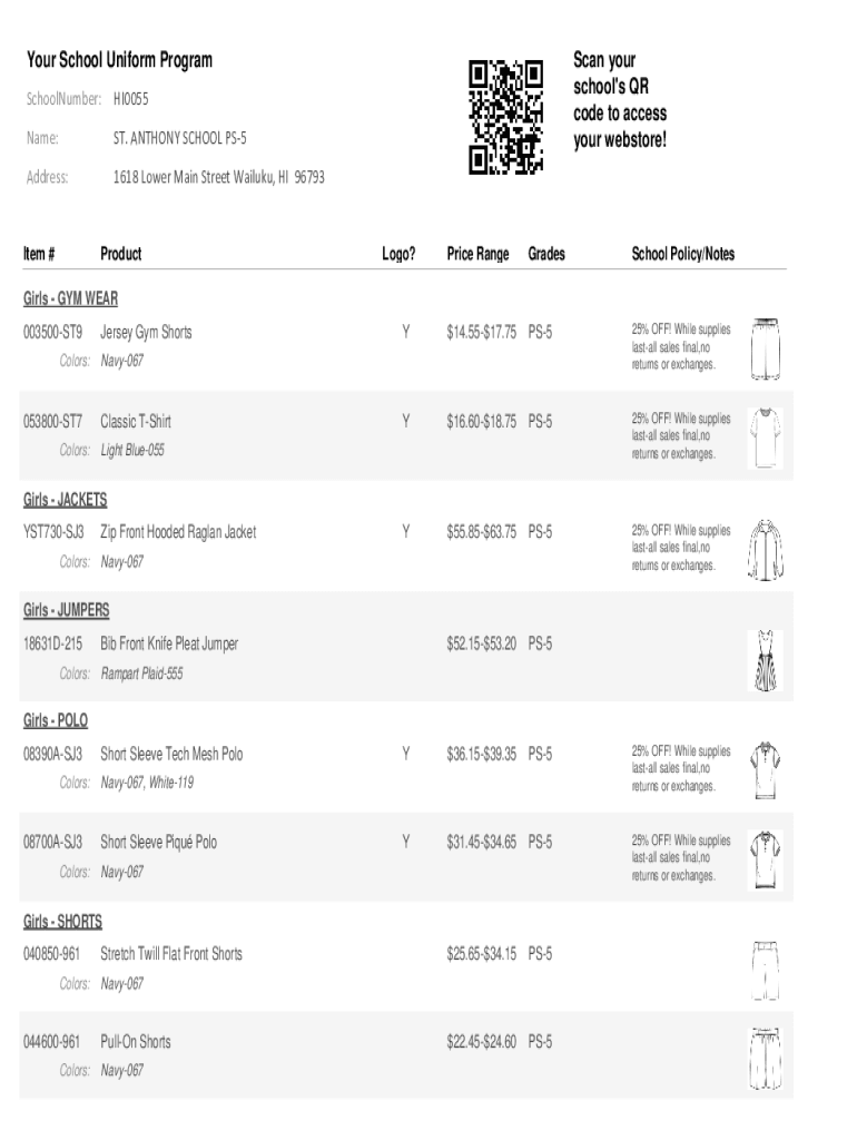 Your School Uniform Program SchoolNumber:HI0055Name:ST. ANTHONY SCHOOL PS5Address:1618 Lower Main Street Wailuku, HI 96793Item #ProductScan your school\'s QR code to access your webstore!Logo?Price