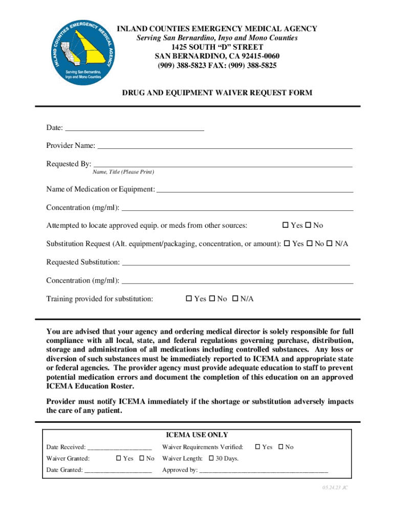 INLAND COUNTIES EMERGENCY MEDICAL AGENCY Serving San Bernardino, Inyo and Mono Counties 1425 SOUTH D STREET SAN BERNARDINO, CA 924150060 (909) 3885823 FAX: (909) 3885825DRUG AND EQUIPMENT WAIVER REQUEST