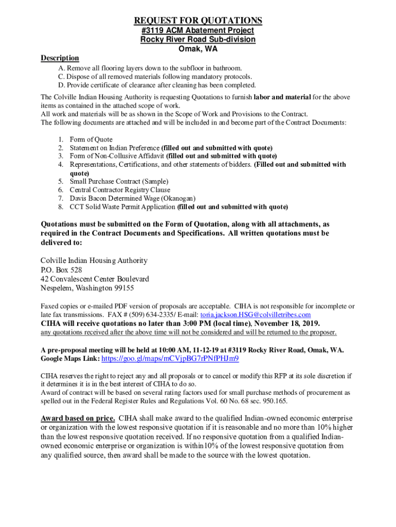 REQUEST FOR QUOTATIONS #3119 ACM Abatement Project Rocky River Road Subdivision Omak, WA Description A. Remove all flooring layers down to the subfloor in bathroom. C. Dispose of all removed materials