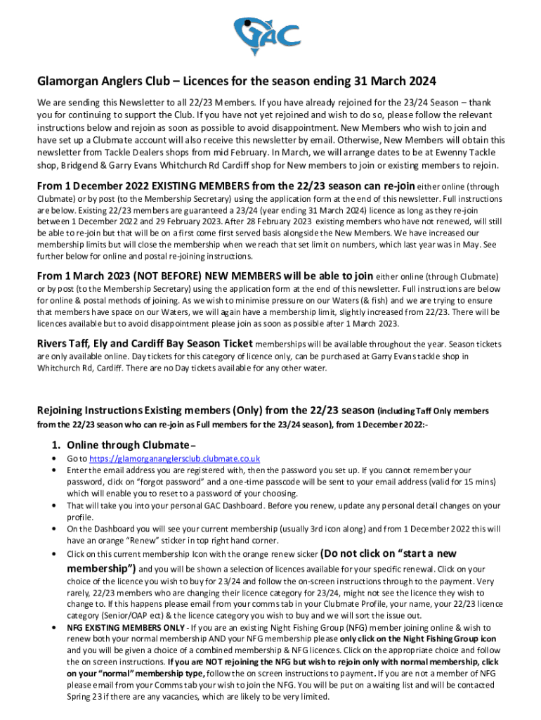 Glamorgan Anglers Club Licences for the season ending 31 March 2024 We are sending this Newsletter to all 22/23 Members. If you have already rejoined for the 23/24 Season thank you for continuing