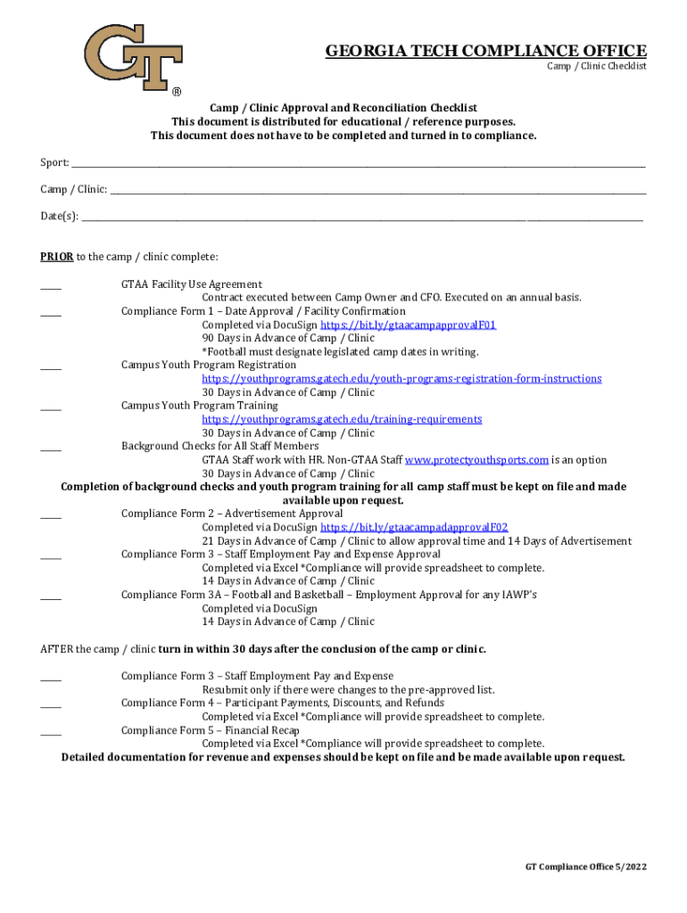 GEORGIA TECH COMPLIANCE OFFICE Camp / Clinic ChecklistCamp / Clinic Approval and Reconciliation Checklist This document is distributed for educational / reference purposes. This document does not