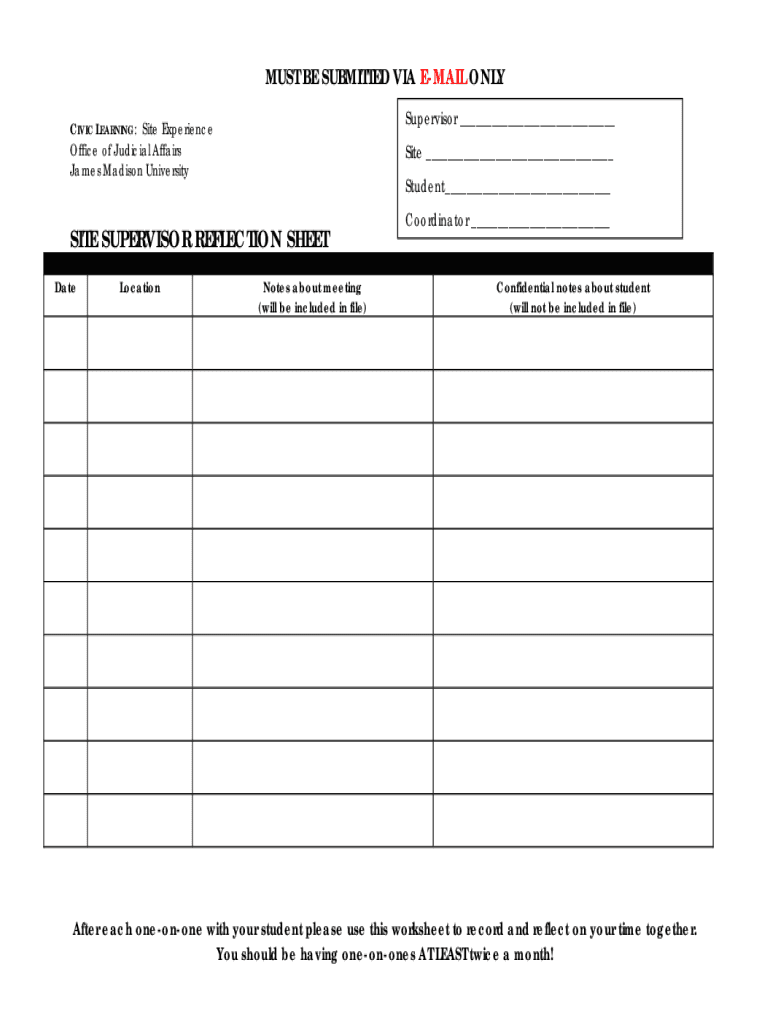 MUST BE SUBMITTED VIA EMAIL ONLY Supervisor ___CIVIC LEARNING: Site Experience Office of Judicial Affairs James Madison UniversitySite ___ Student___SITE SUPERVISOR REFLECTION SHEET DateLocationNotes