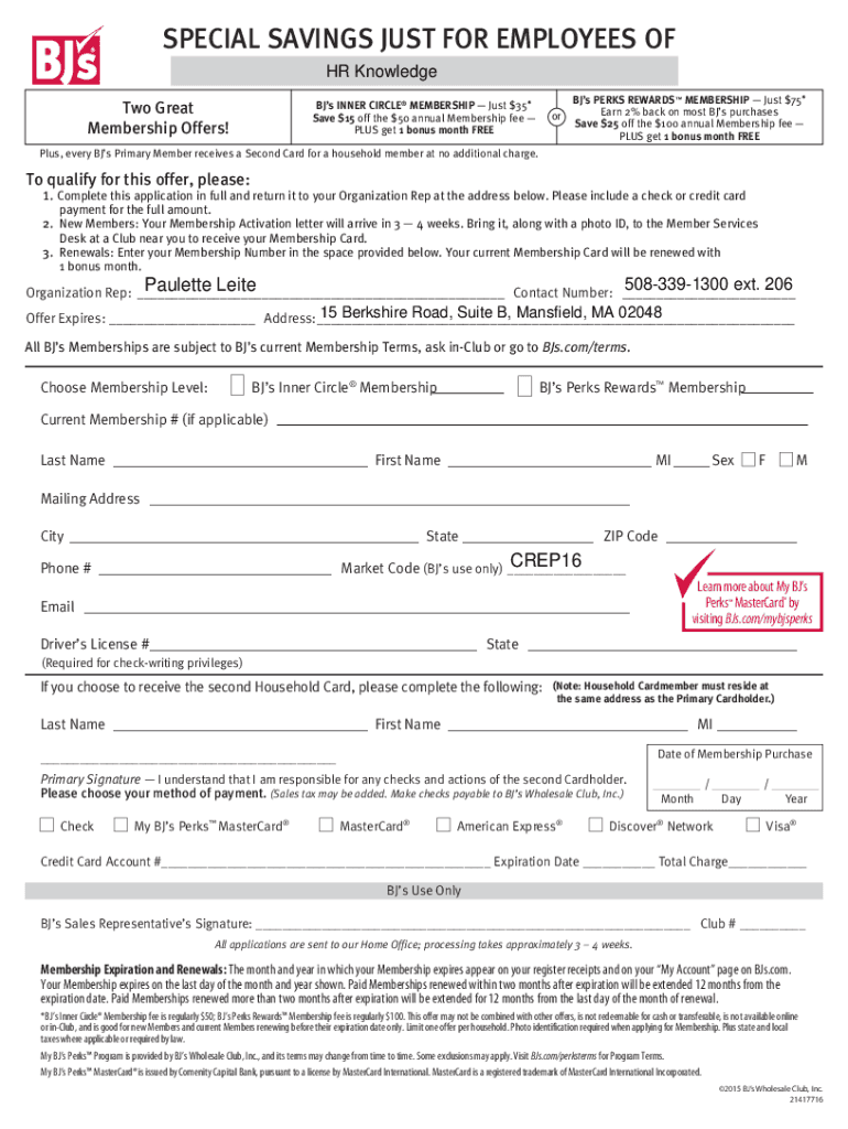 SPECIAL SAVINGS JUST FOR EMPLOYEES OF HR KnowledgeTwo Great Membership Offers!BJs INNER CIRCLE MEMBERSHIP Just $35* Save $15 off the $50 annual Membership fee PLUS get 1 bonus month FREEorBJs PERKS