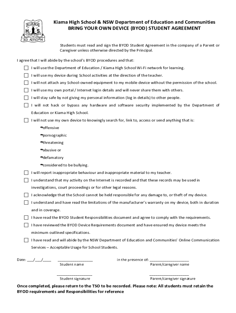 Kiama High School & NSW Department of Education and CommunitiesBRING YOUR OWN DEVICE (BYOD) STUDENT AGREEMENTStudents must read and sign the BYOD Student Agreement in the company of a Parent orCaregiver