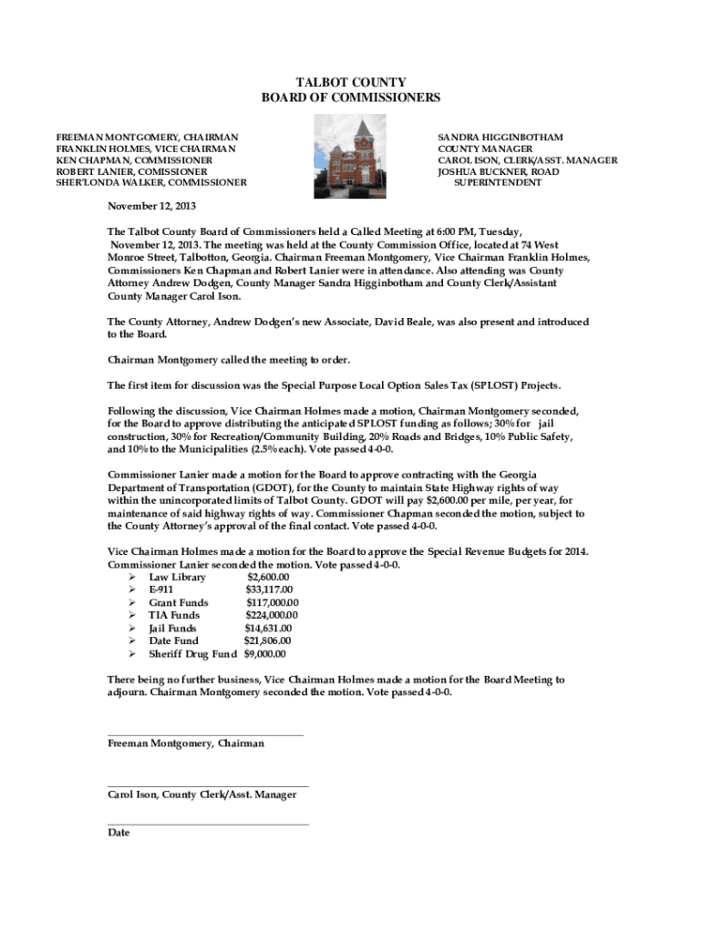 TALBOT COUNTY BOARD OF COMMISSIONERS FREEMAN MONTGOMERY, CHAIRMAN FRANKLIN HOLMES, VICE CHAIRMAN KEN CHAPMAN, COMMISSIONER ROBERT LANIER, COMISSIONER SHERLONDA WALKER, COMMISSIONERSANDRA HIGGINBOTHAM