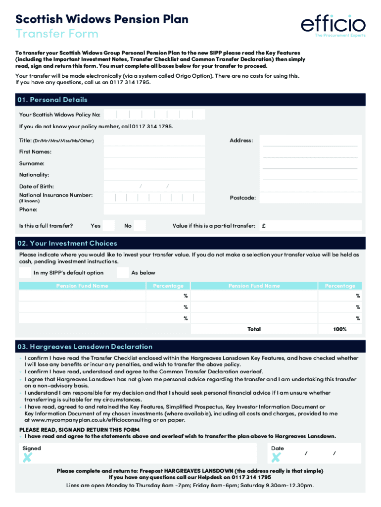 Scottish Widows Pension Plan Transfer Form To transfer your Scottish Widows Group Personal Pension Plan to the new SIPP please read the Key Features (including the Important Investment Notes, Transfer
