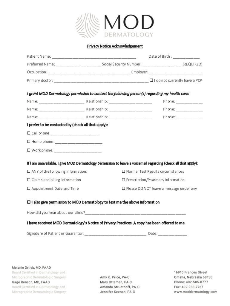 Privacy Notice Acknowledgement Patient Name: ___Date of Birth : ___Preferred Name: ___ Social Security Number: ___ (REQUIRED) Occupation: ___ Employer: ___ Primary doctor: ___ I do not currently have