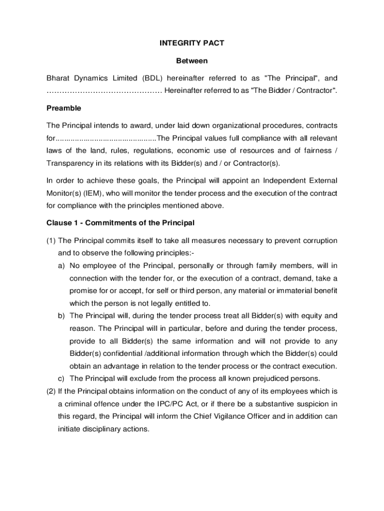 INTEGRITY PACT Between Bharat Dynamics Limited (BDL) hereinafter referred to as \"The Principal\", and Hereinafter referred to as \"The Bidder / Contractor\". Preamble The Principal intends to award,