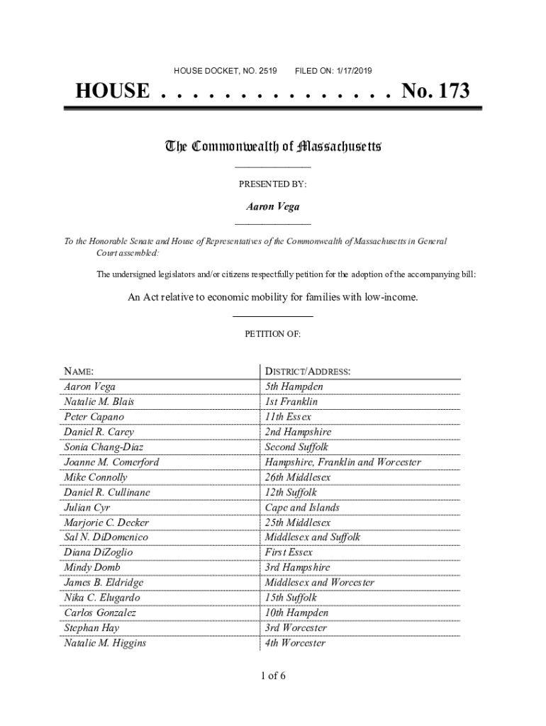 HOUSE DOCKET, NO. 2519FILED ON: 1/17/2019HOUSE . . . . . . . . . . . . . . . No. 173 The Commonwealth of Massachusetts ___ PRESENTED BY:Aaron Vega ___ To the Honorable Senate and House of Representatives