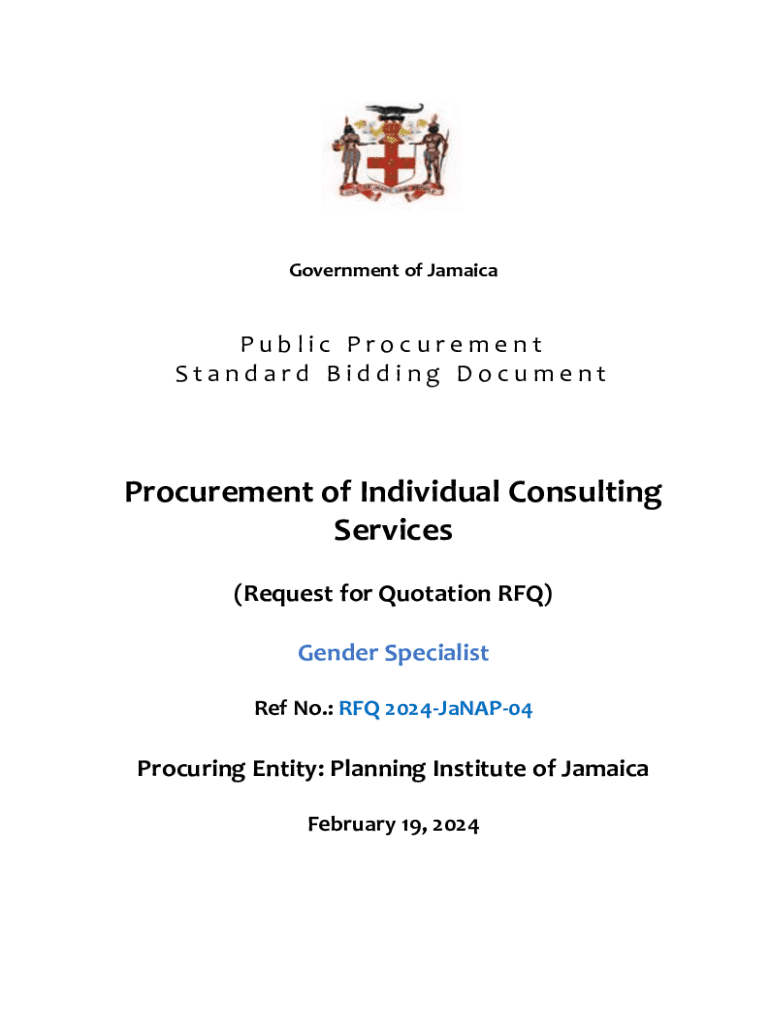 Government of JamaicaPublic Procurement Standard Bidding DocumentProcurement of Individual Consulting Services (Request for Quotation RFQ) Gender Specialist Ref No.: RFQ 2024JaNAP04Procuring Entity: