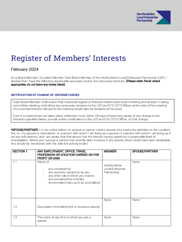 Register of Members Interests February 2024 As a Board Member/ Coopted Member/ SubBoard Member of the Hertfordshire Local Enterprise Partnership (LEP). I declare that I have the following disclosable