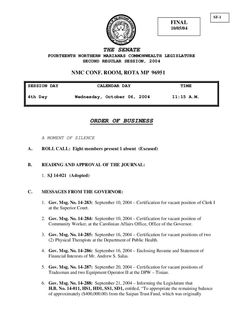 SF1FINAL 10/05/04THE SENATE FOURTEENTH NORTHERN MARIANAS COMMONWEALTH LEGISLATURE SECOND REGULAR SESSION, 2004NMC CONF. ROOM, ROTA MP 96951 SESSION DAY 4th DayCALENDAR DAY Wednesday, October 06, 2004TIME