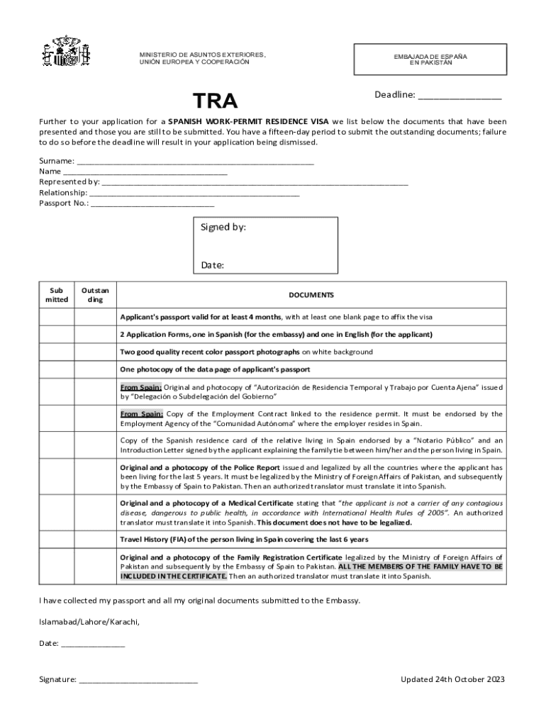 MINISTERIO DE ASUNTOS EXTERIORES, UNIN EUROPEA Y COOPERACINEMBAJADA DE ESPAA EN PAKISTNDeadline: ___TRAFurther to your application for a SPANISH WORKPERMIT RESIDENCE VISA we list below the documents