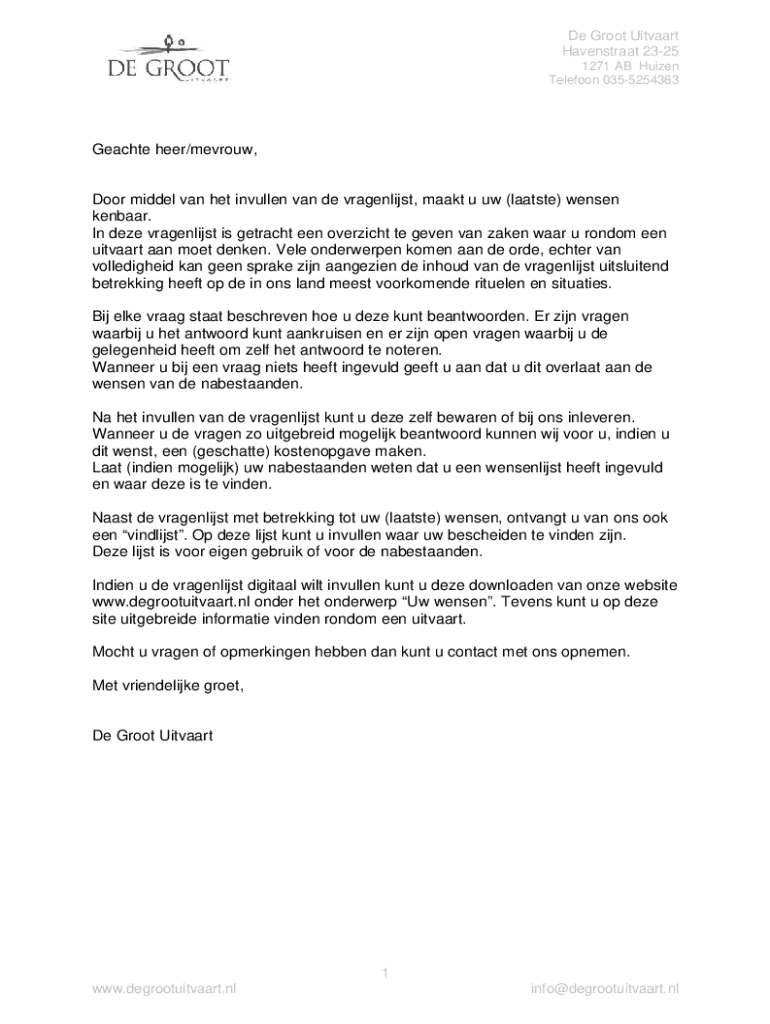 De Groot Uitvaart Havenstraat 2325 1271 AB Huizen Telefoon 0355254363Geachte heer/mevrouw,Door middel van het invullen van de vragenlijst, maakt u uw (laatste) wensen kenbaar. In deze vragenlijst