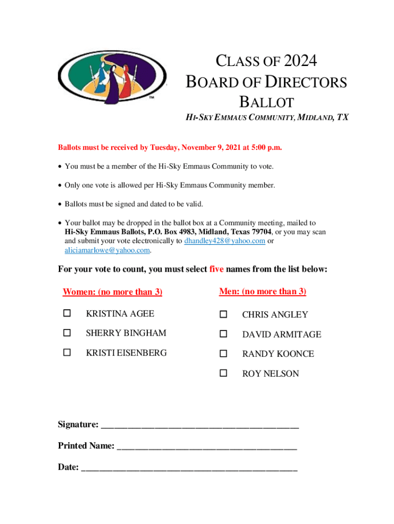 CLASS OF 2024BOARD OF DIRECTORS BALLOT HISKY EMMAUS COMMUNITY, MIDLAND, TX Ballots must be received by Tuesday, November 9, 2021 at 5:00 p.m. You must be a member of the HiSky Emmaus Community to