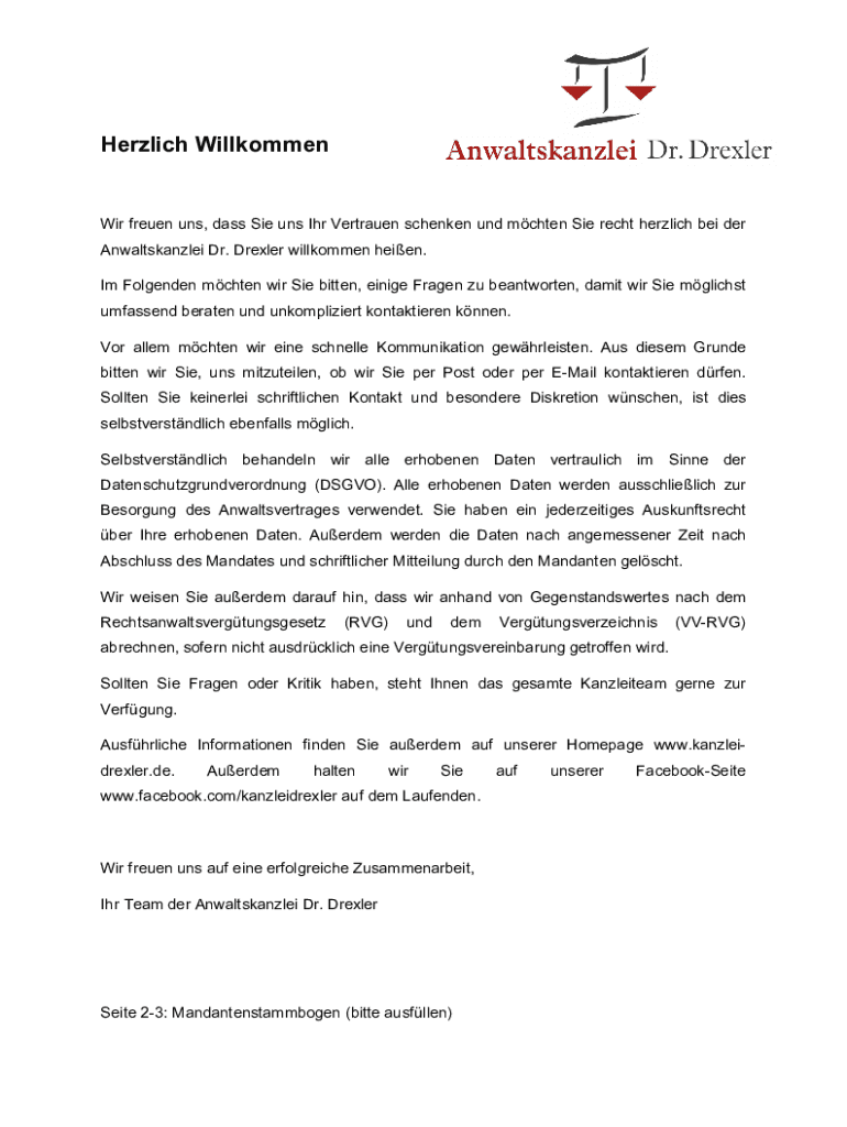 Herzlich WillkommenWir freuen uns, dass Sie uns Ihr Vertrauen schenken und mchten Sie recht herzlich bei der Anwaltskanzlei Dr. Drexler willkommen heien. Im Folgenden mchten wir Sie bitten, einige