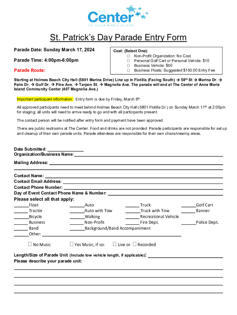 St. Patricks Day Parade Entry Form Parade Date: Sunday March 17, 2024 Parade Time: 4:00pm6:00pm Parade Route:Cost: (Select One): NonProfit Organization: No Cost Personal Golf Cart or Personal Vehicle: