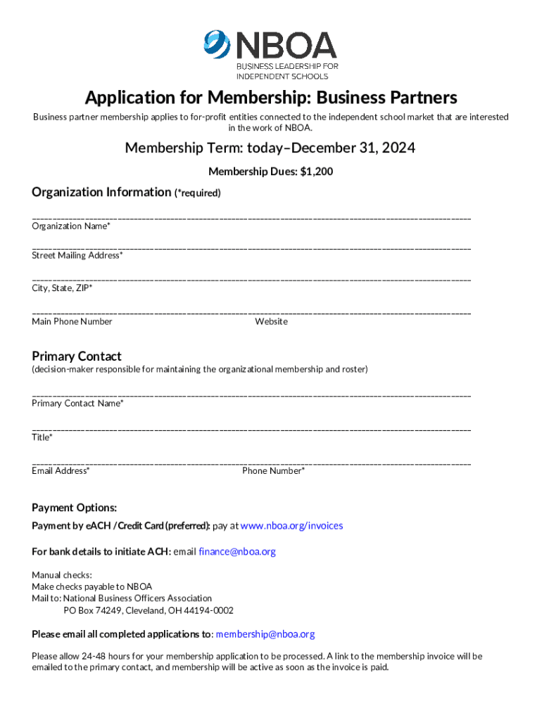 Application for Membership: Business Partners Business partner membership applies to forprofit entities connected to the independent school market that are interested in the work of NBOA.Membership