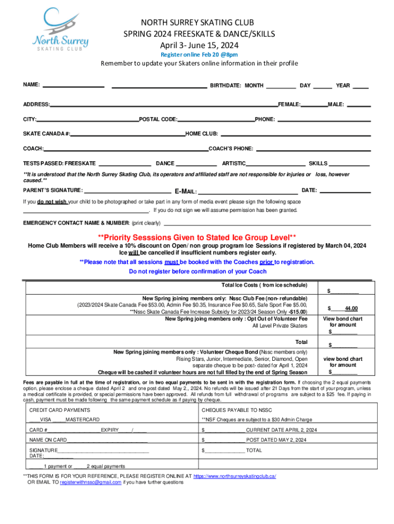 NORTH SURREY SKATING CLUB SPRING 2024 FREESKATE & DANCE/SKILLS April 3 June 15, 2024 Register online Feb 20 @8pmRemember to update your Skaters online information in their profile NAME:BIRTHDATE: