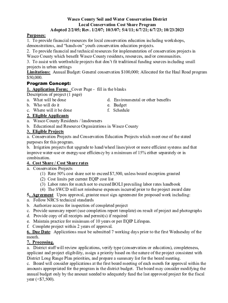Wasco County Soil and Water Conservation District Local Conservation Cost Share Program Adopted 2/2/05; Rev. 1/2/07; 10/3/07; 5/4/11; 6/7/21; 6/7/23; 10/23/2023 Purposes: 1. To provide financial resources