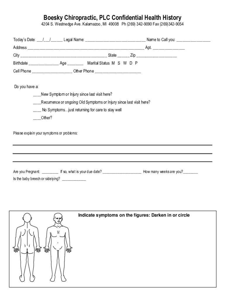 Boesky Chiropractic, PLC Confidential Health History 4204 S. Westnedge Ave. Kalamazoo, MI 49008 Ph (269) 3429090 Fax (269)3429054Todays Date: ___/___/___ Legal Name: ___ Name to Call you: ___ Address