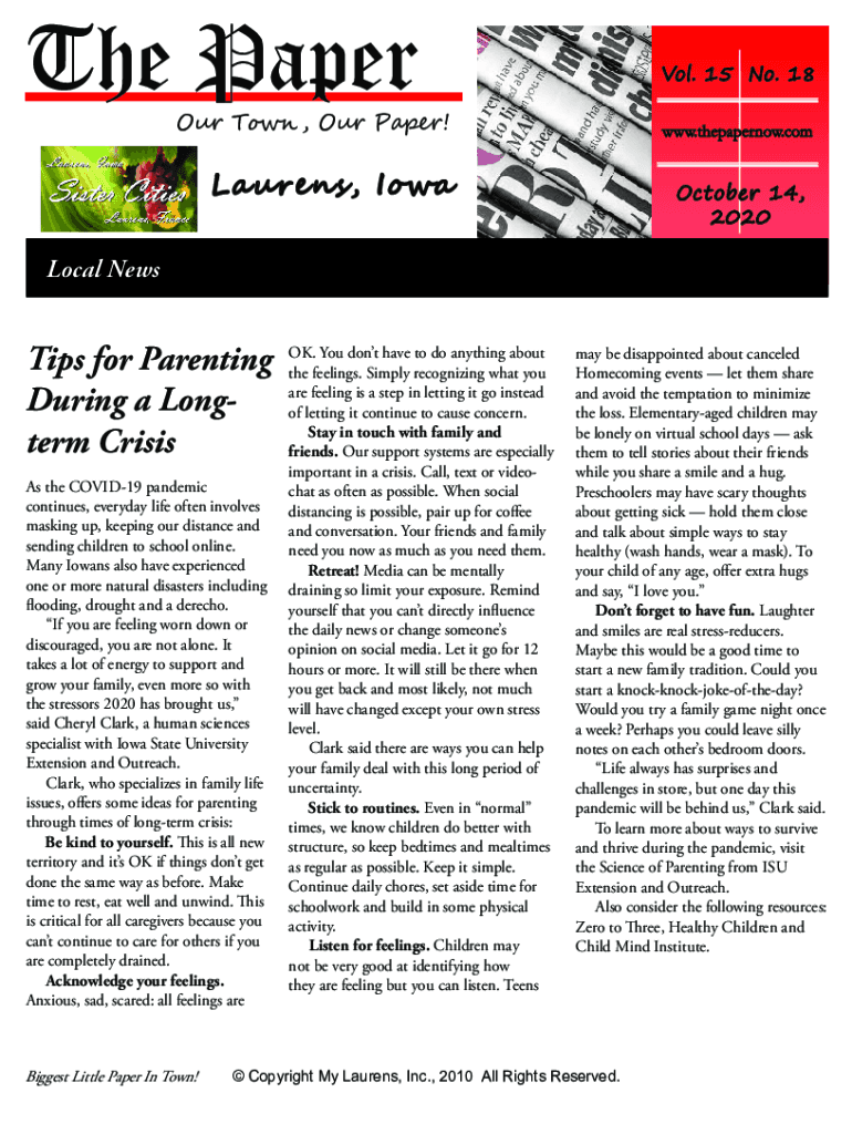 The PaperVol. 15 No. 18Our Town , Our Paper!www.thepapernow.comLaurens, IowaOctober 14, 2020Local NewsTips for Parenting During a Longterm Crisis As the COVID19 pandemic continues, everyday life often