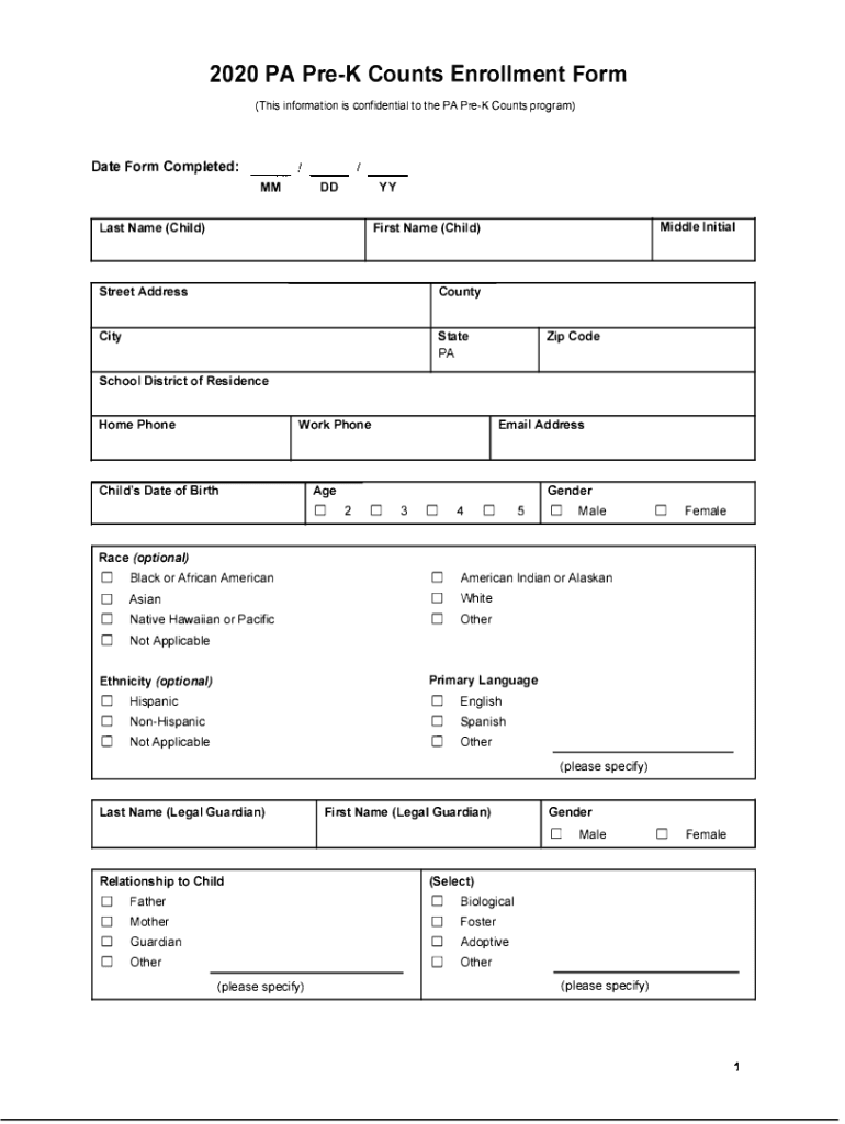 2020 PA PreK Counts Enrollment Form (This information is confidential to the PA PreK Counts program)Date Form Completed: MMyyDDLast Name (Child)Middle InitialFirst Name (Child)Street AddressCountyCityState
