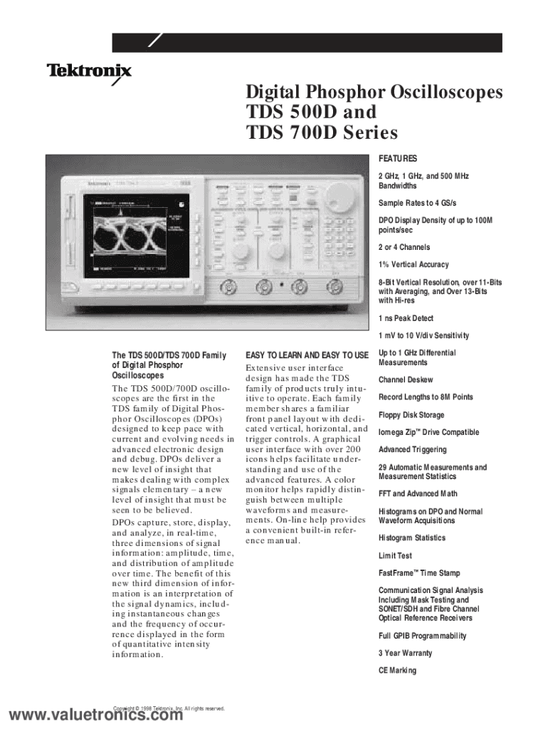 Digital Phosphor Oscilloscopes TDS 500D and TDS 700D Series FEATURES 2 GHz, 1 GHz, and 500 MHz Bandwidths Sample Rates to 4 GS/s DPO Display Density of up to 100M points/sec 2 or 4 Channels 1% Vertical