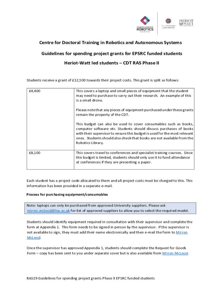 Centre for Doctoral Training in Robotics and Autonomous Systems Guidelines for spending project grants for EPSRC funded students HeriotWatt led students CDT RAS Phase II Students receive a grant of