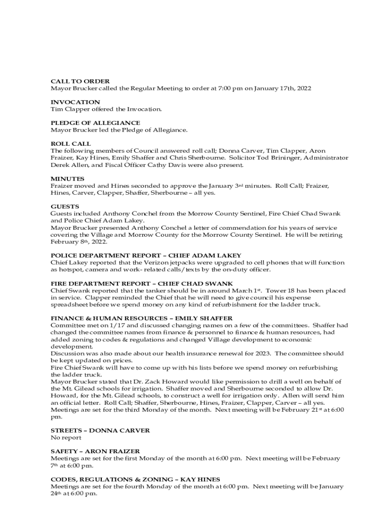 CALL TO ORDER Mayor Brucker called the Regular Meeting to order at 7:00 pm on January 17th, 2022 INVOCATION Tim Clapper offered the Invocation. PLEDGE OF ALLEGIANCE Mayor Brucker led the Pledge of