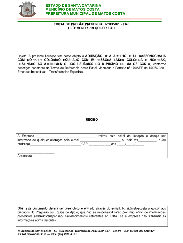 ESTADO DE SANTA CATARINA MUNICPIO DE MATOS COSTA PREFEITURA MUNICIPAL DE MATOS COSTA EDITAL DO PREGO PRESENCIAL N 03/2020 FMS TIPO: MENOR PREO POR LOTEObjeto: A presente licitao tem como objeto a